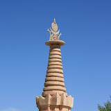 Bevor wir Dunhuang wieder verlassen, besuchen wir noch die berühmten Mogao-Grotten, 25 Kilometer ausserhalb der Stadt. Diesmal nehmen wir den Chauffeur vom Hotel mit, um sicher auch wieder zurückzukommen und nicht wieder dasselbe Problem wie in Xian zu haben. Schon die Fahrt alleine lohnt den Ausflug. Die Strasse führt durch die Steinwüste an den Rand eines Gebirgszuges, immer wieder gibt es sandige Stellen und der Ort wo die Mogao-Grotten liegen erscheint wie eine grüne Oase in der Ferne inmitten der Wüste. Tatsächlich sind die Grotten von einem herrlichen Park umgeben, in dem es von Blumen nur so duftet. Die Berge im Hintergrund sind stark zerklüftet und zu ihnen führen verschiedene Stupas.